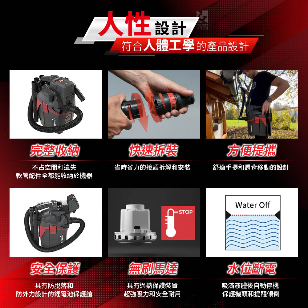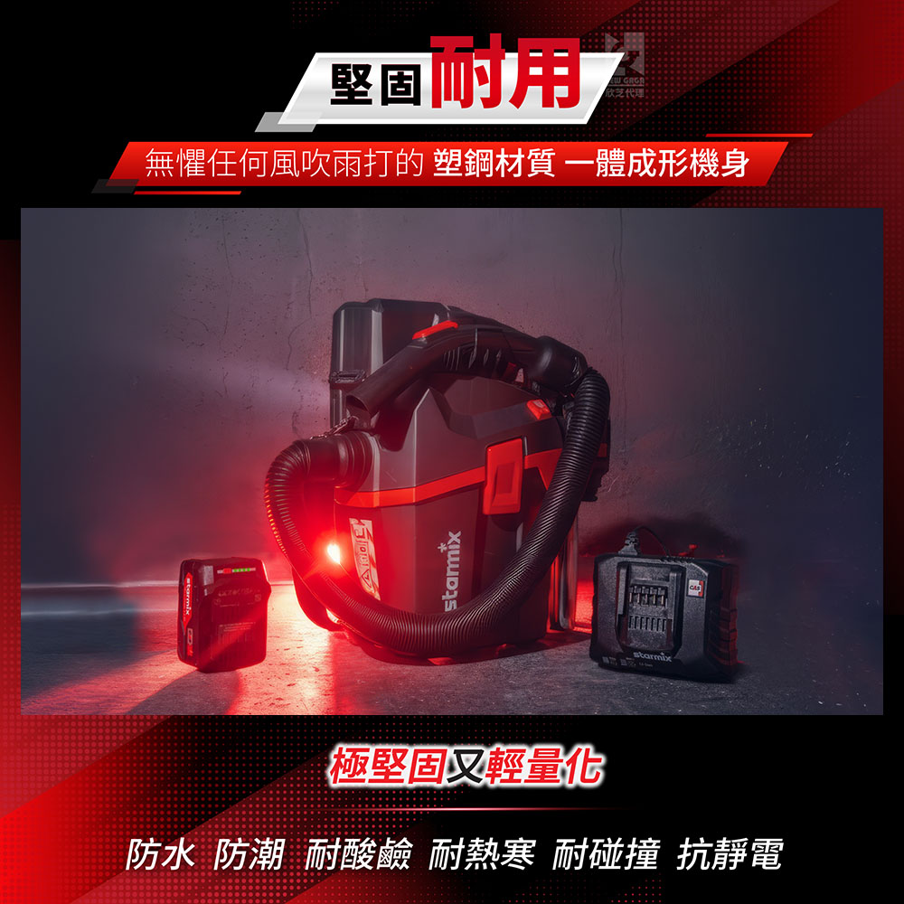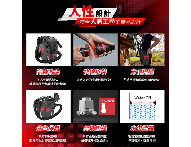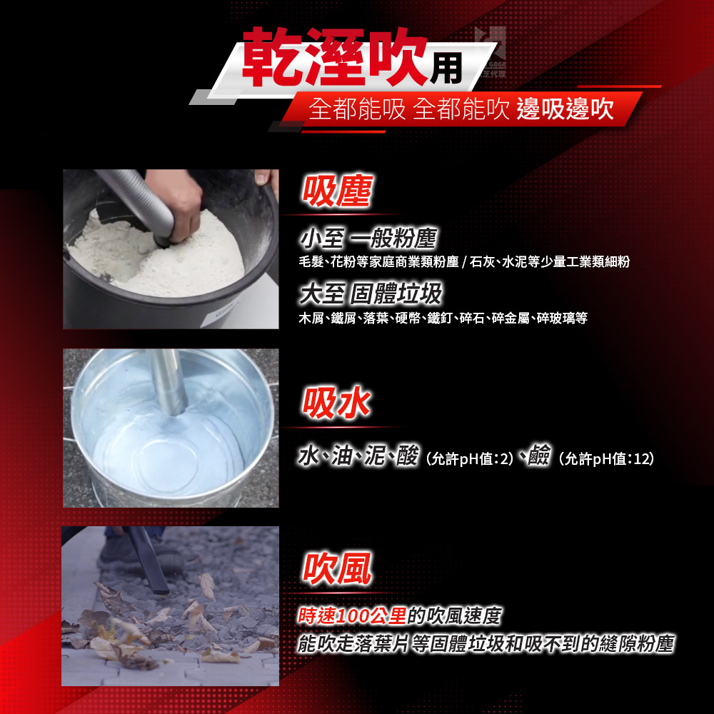 | 乾溼吹用 | 乾溼發明者,吸塵、吸水、吸油、吸酸、吸鹼及 100km/h 的強勁吹風,不再只有吸塵。 |