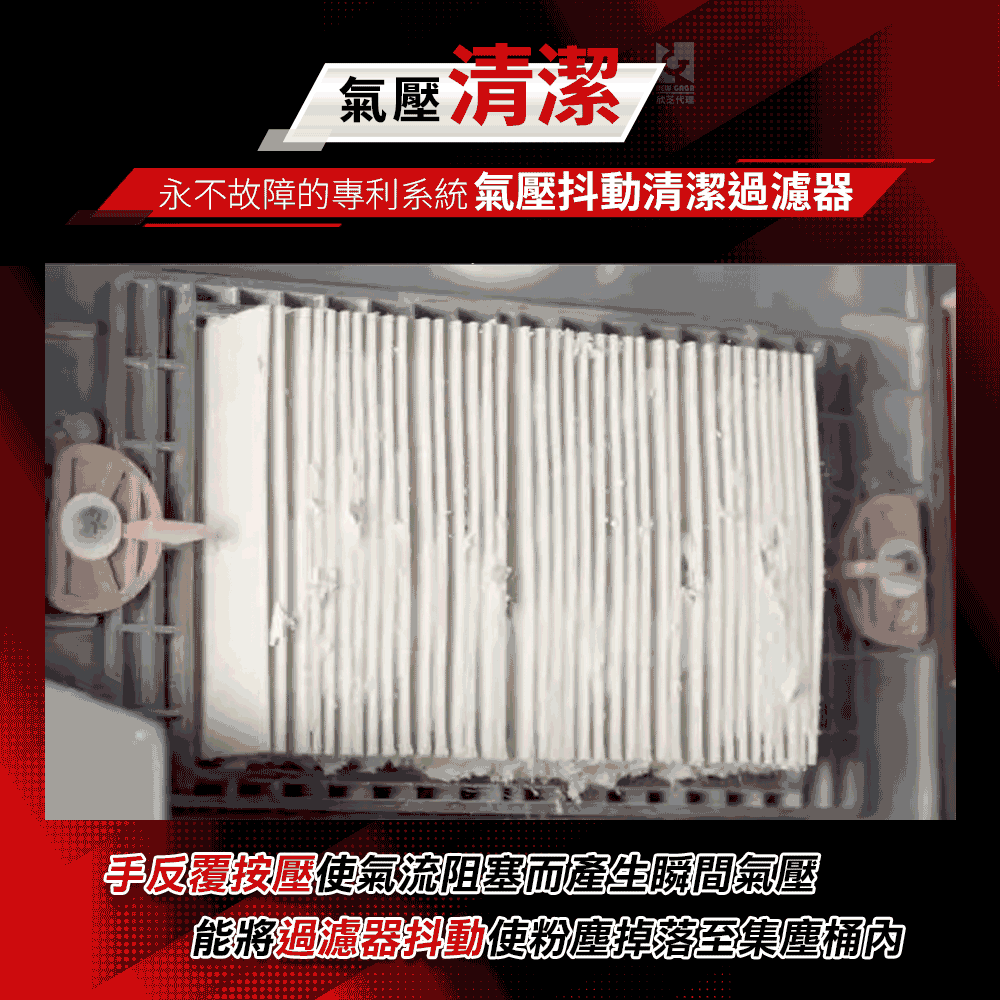 | 氣壓抖塵 | 手按開啟氣壓模式抖動清潔過濾器,靠著氣流阻寒而產生瞬間氣壓,能將過濾器抖動使粉塵掉落至桶內。 |