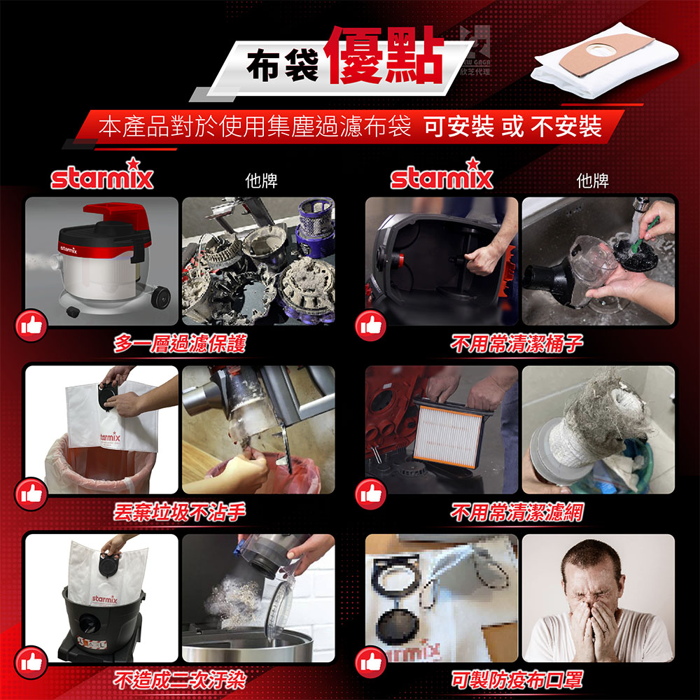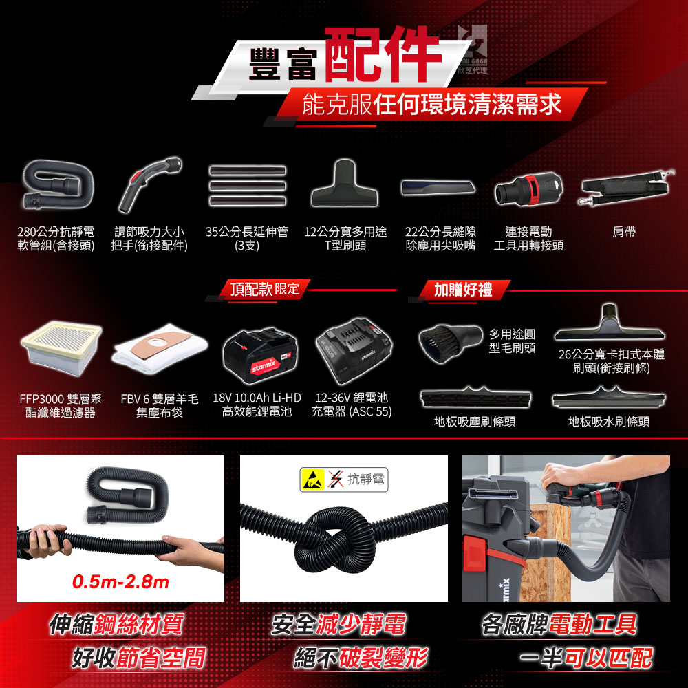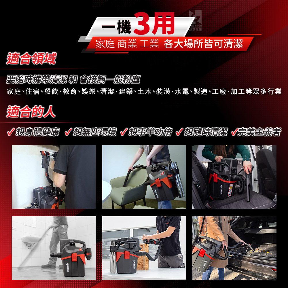 | 一機三用 | 家、商業、工業(少量粉末環境),各大場所皆可清潔。 |