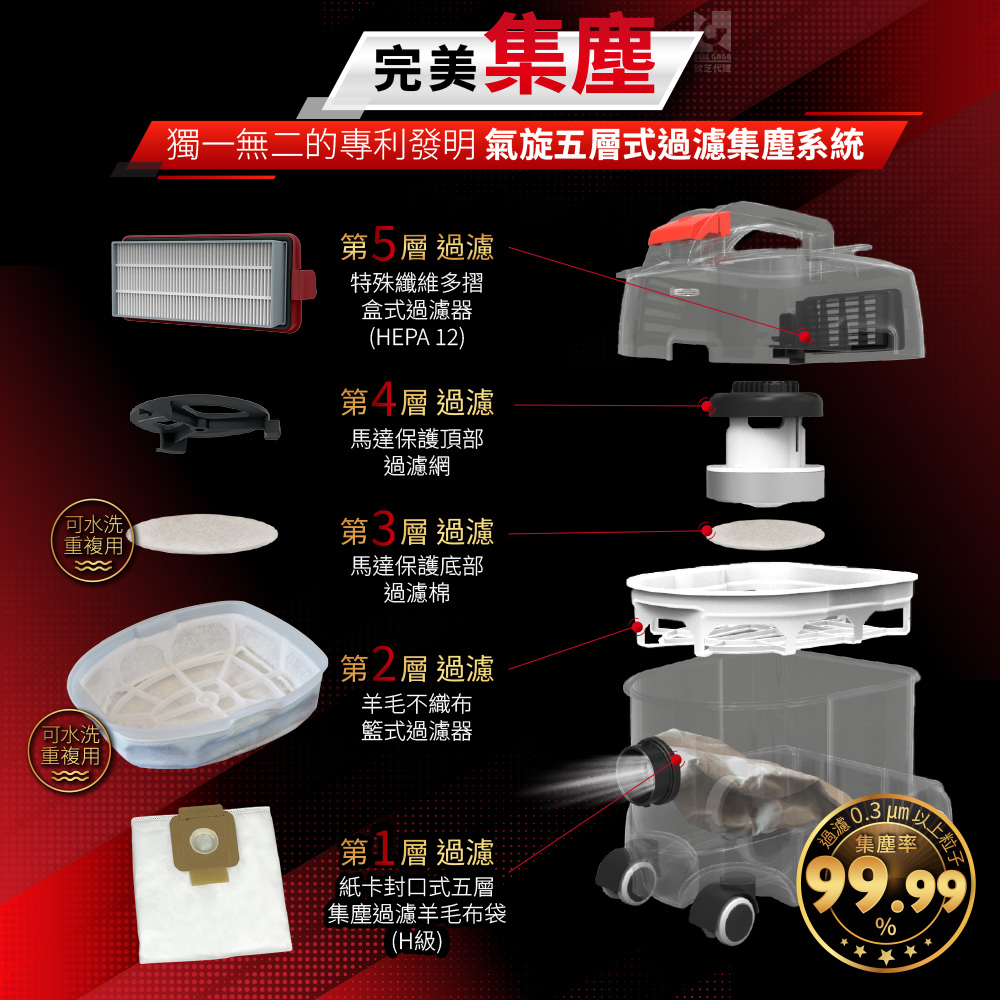 | 五層過濾 | 專利系統,過濾小至細菌、塵螨、花粉等,大至木屑、落葉、玻璃碎片等。 |