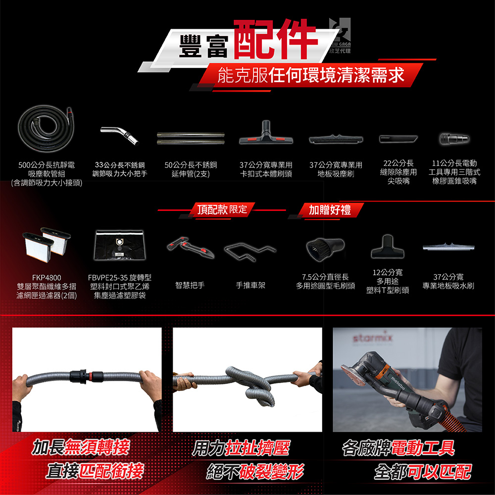 一機四用 | 家、商業、工業(極端粉末環境)、無塵(萬級以上等級),各大場所皆可清潔。 |