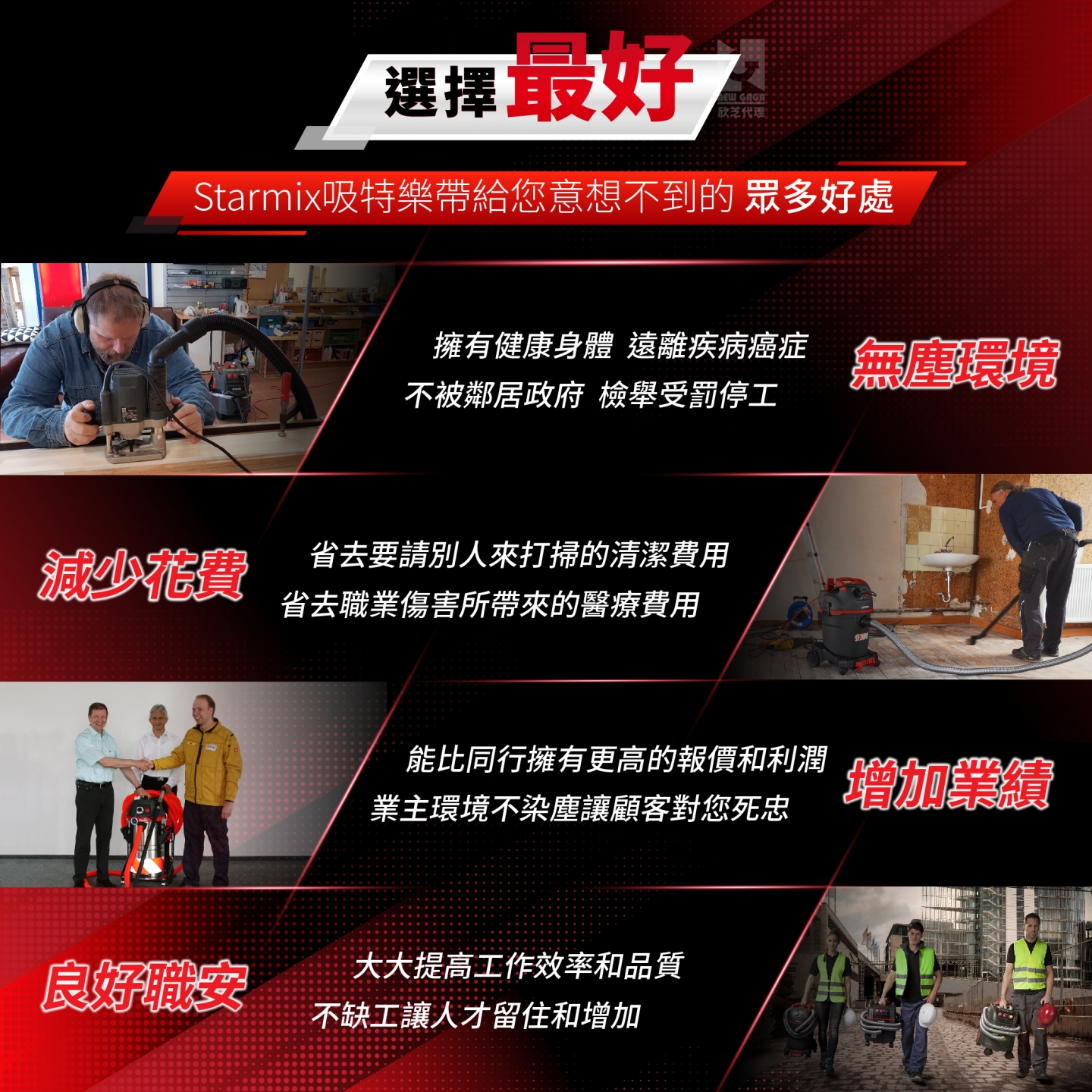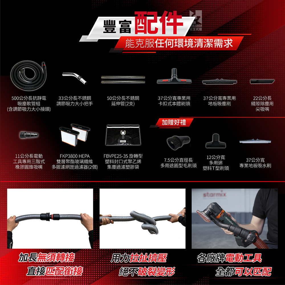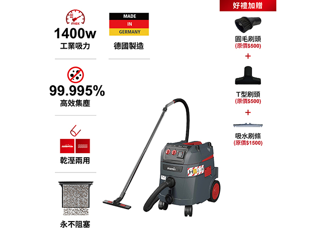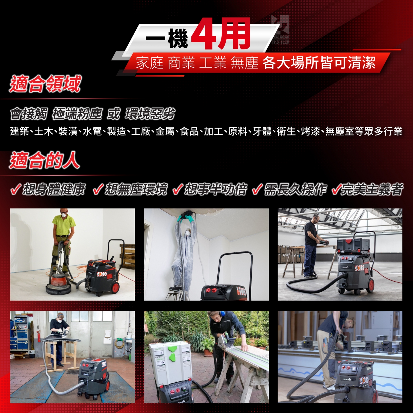 | 一機四用 | 家、商業、工業(極端粉末環境)、無塵(千級以上等級),各大場所皆可清潔。 |