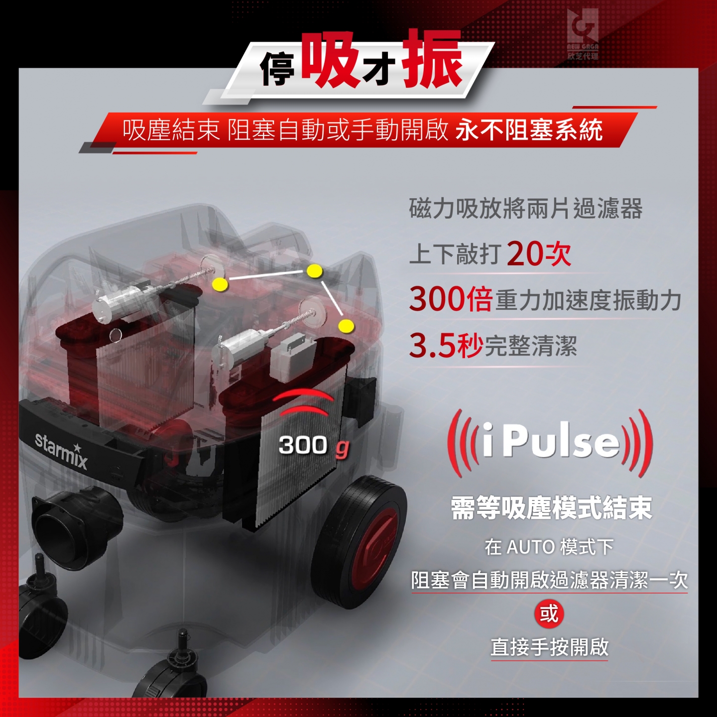 | 永不阻塞 | 專利發明,吸塵結束,手按開啟電磁脈衝模式振動清潔過濾器,300倍重力加速度振動力,3.5秒內完整清潔。 |