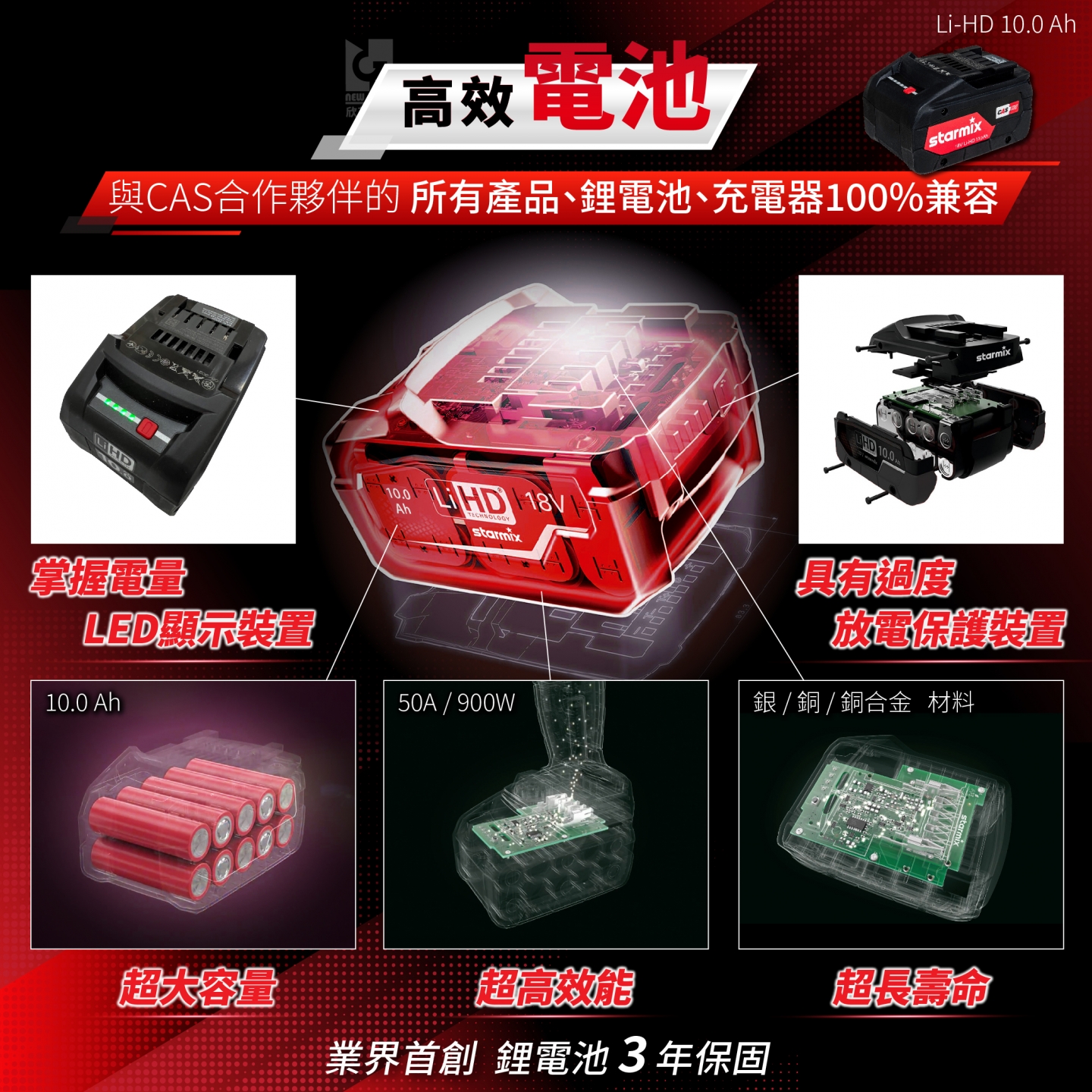 | 高效電池 | 專利氣冷式散熱技術,高效能和長壽命,具有過度放電保護,與CAS合作夥伴的所有產品100%兼容。 |