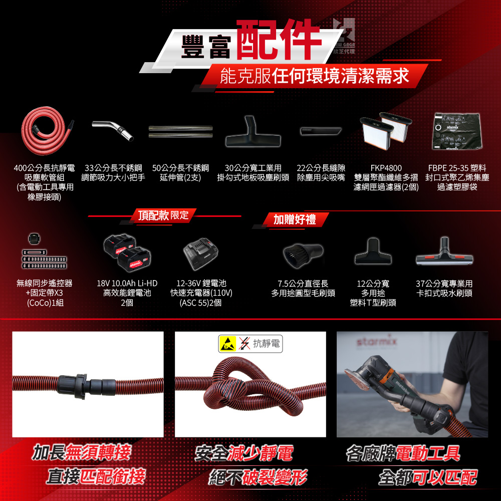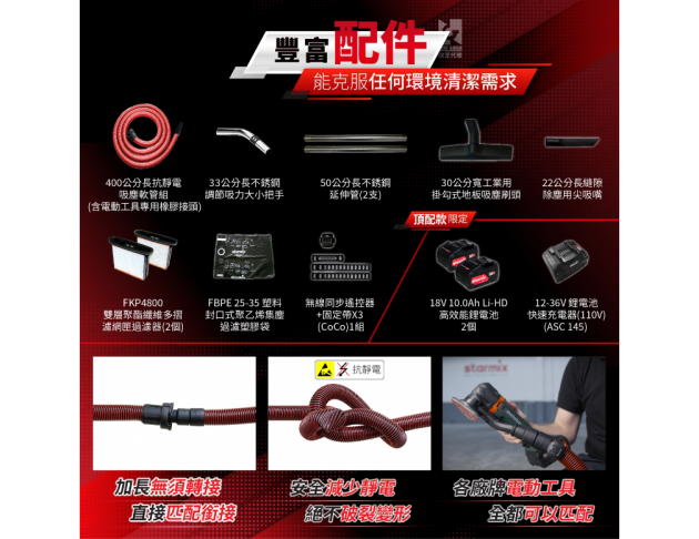 | 無線同步 | 專利發明,不受電源約束,透過電動工具運作,遠端自動同步連接啟動吸塵器開關,也可用手動方式連接。 |