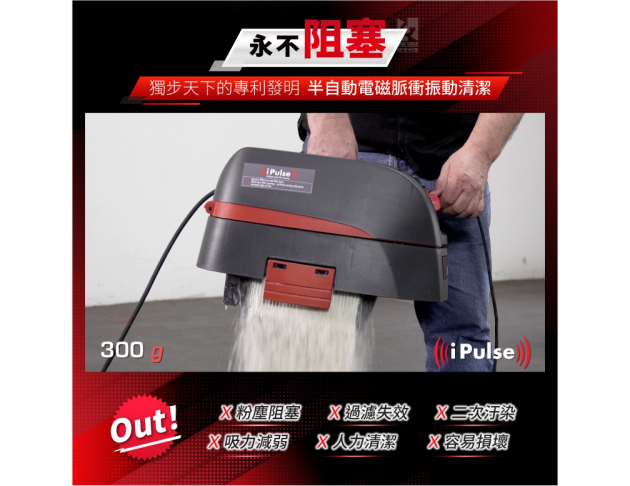| 永不阻塞 | 專利發明,吸塵結束,手按開啟電磁脈衝模式振動清潔過濾器,300倍重力加速度振動力,3.5秒內完整清潔。 |