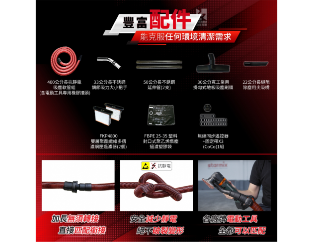 | 無線同步 | 專利發明,不受電源約束,透過電動工具運作,遠端自動同步連接啟動吸塵器開關,也可用手動方式連接。 |