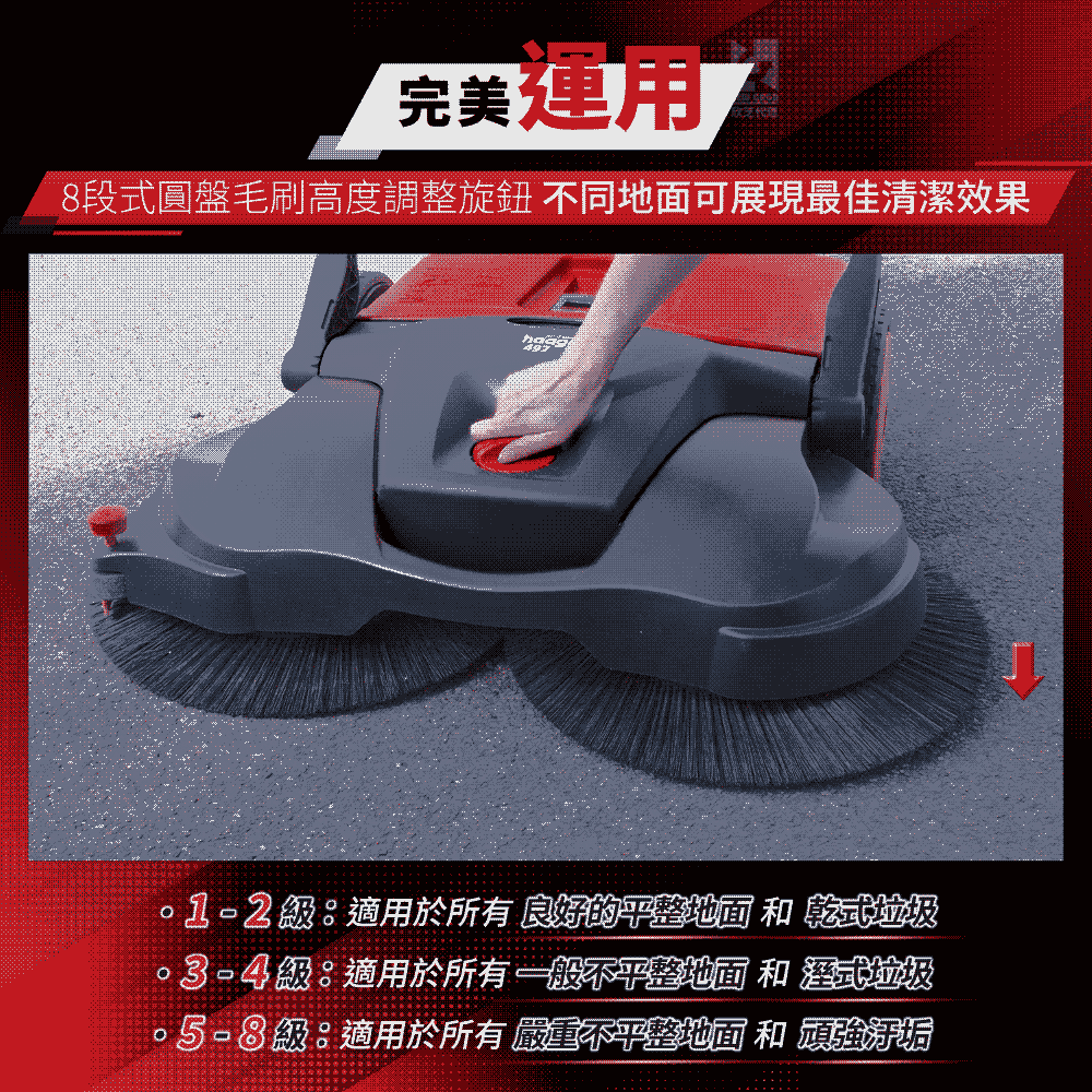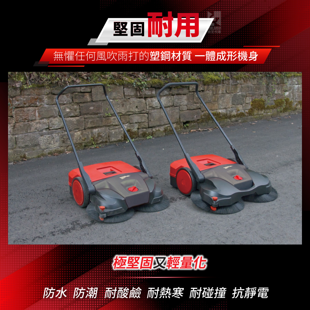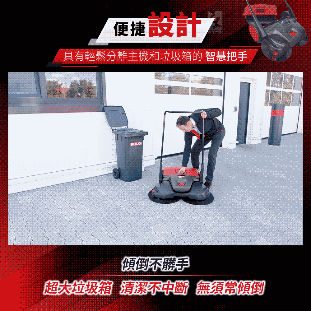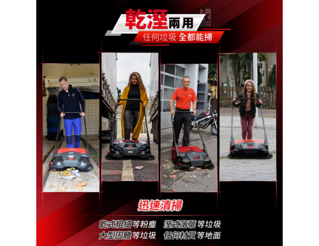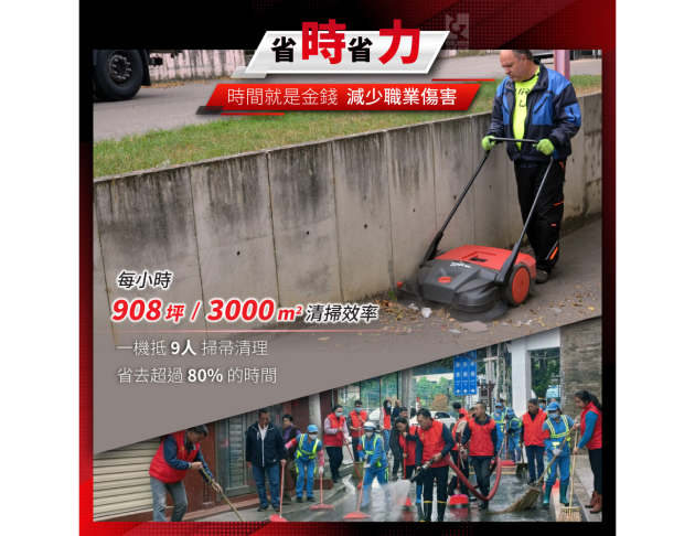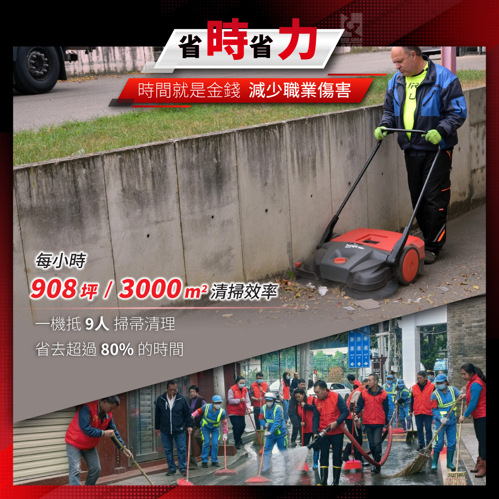 省時省⼒ | 免⽤電池、汽油、電線,⼿推驅動每⼩時908坪的清掃效率,⼀機抵9⼈使⽤傳統掃帚清理。 |