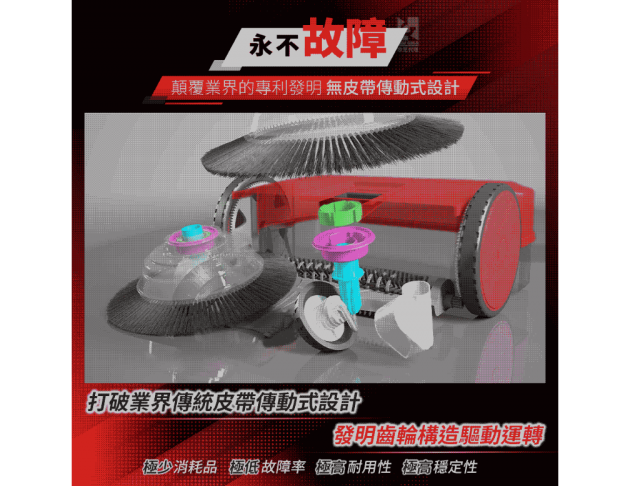 永不故障 | 專利發明,無⽪帶傳動設計,⿒輪構造驅動運轉,運⾏平穩順暢,超低故障率,超⾼耐⽤性。 |