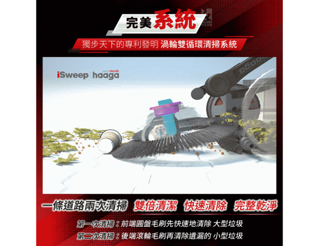 渦輪清掃 | 專利科技,⼀條道路兩次清掃,雙倍清潔、快速清除、完整乾淨。 |