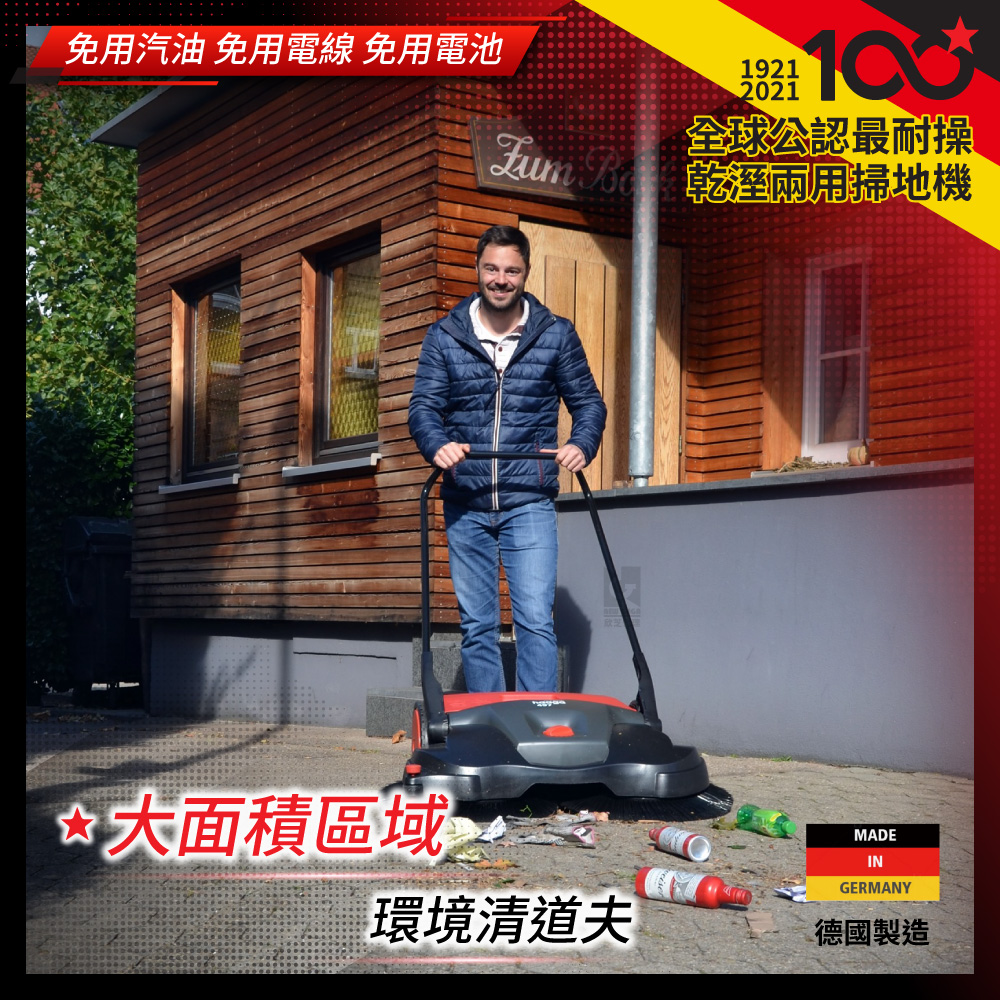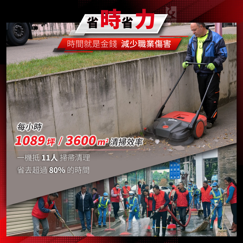 省時省⼒ | 免⽤電池、汽油、電線,⼿推驅動每⼩時1089坪的清掃效率,⼀機抵11⼈使⽤傳統掃帚清理。 |