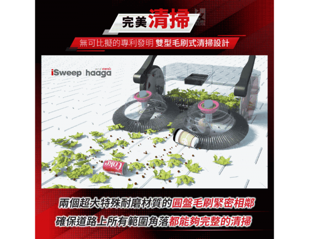 渦輪清掃 | 專利科技,⼀條道路兩次清掃,雙倍清潔、快速清除、完整乾淨。 |